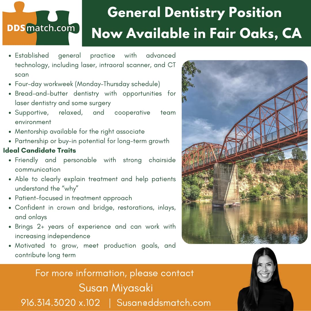ASSOCIATE DENTIST - FAIR OAKS, CA 638733Revenue: N/A Operatories: - Patient Count: - |